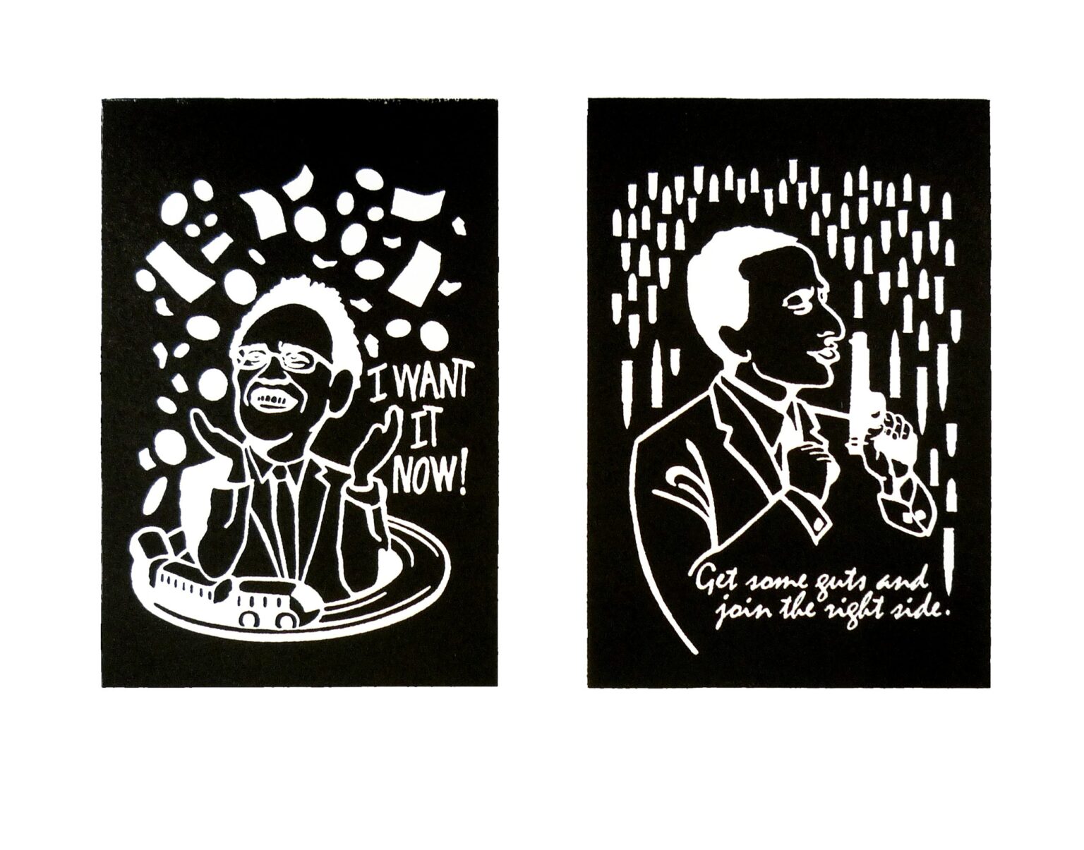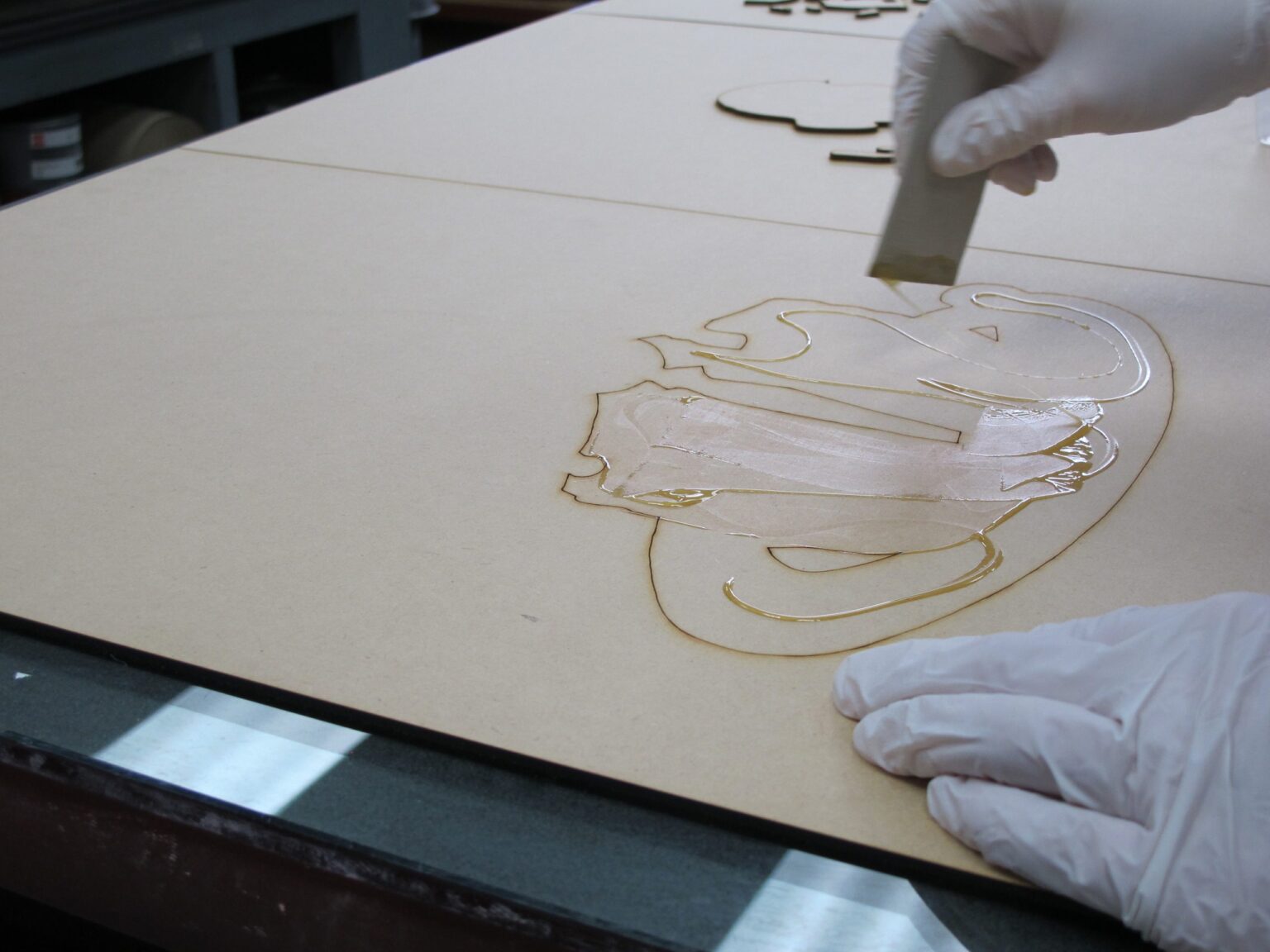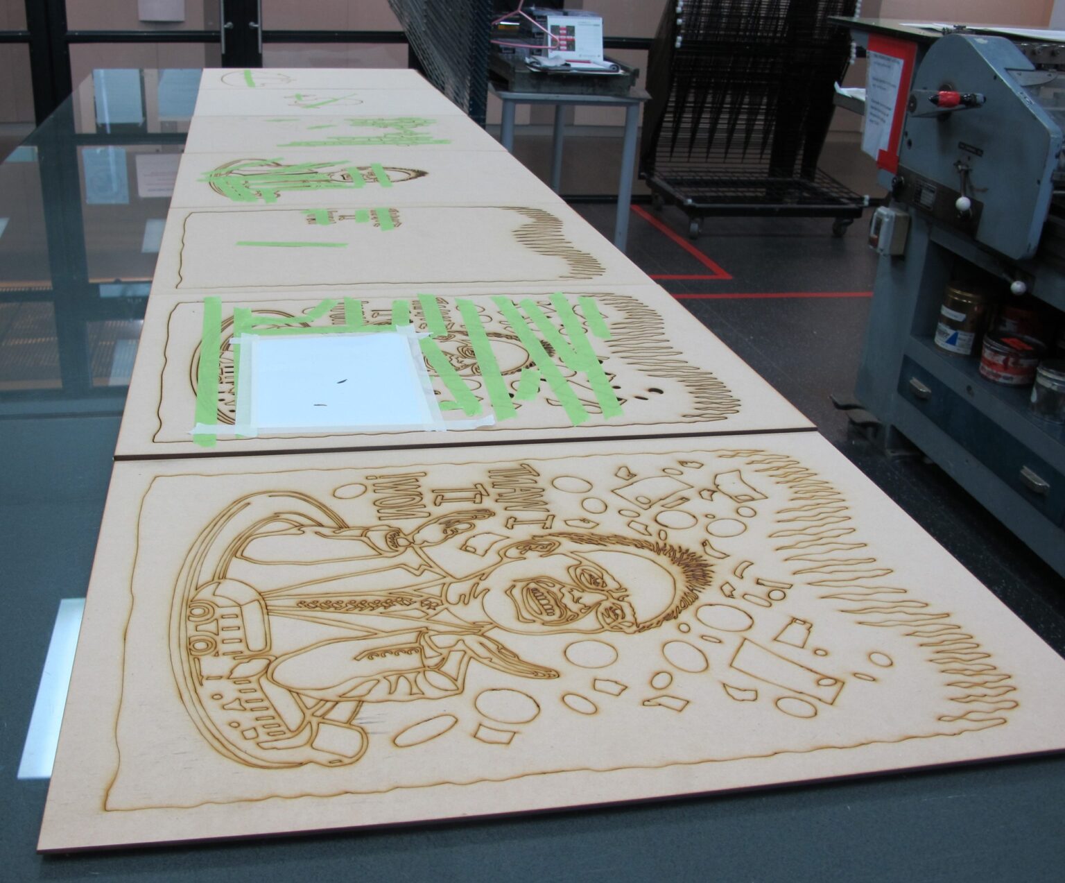 Several print trials were required to get things right. The quality of the final outcome was influenced by the computer files that control the laser cutter and were generated from original artwork, the application of the laser cut printing plates, the press and getting correct press and alignment for registration, and the choice of paper stock.