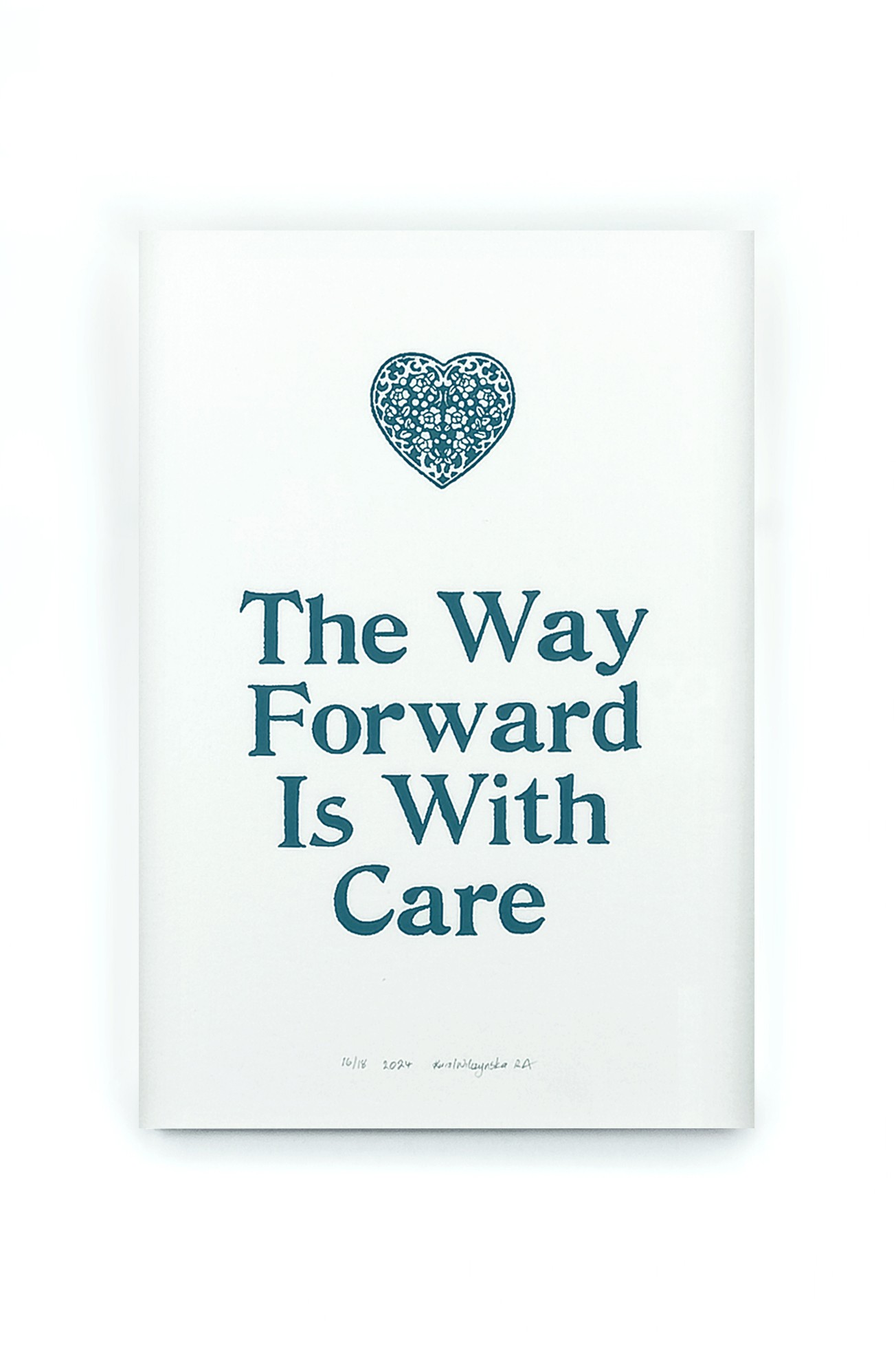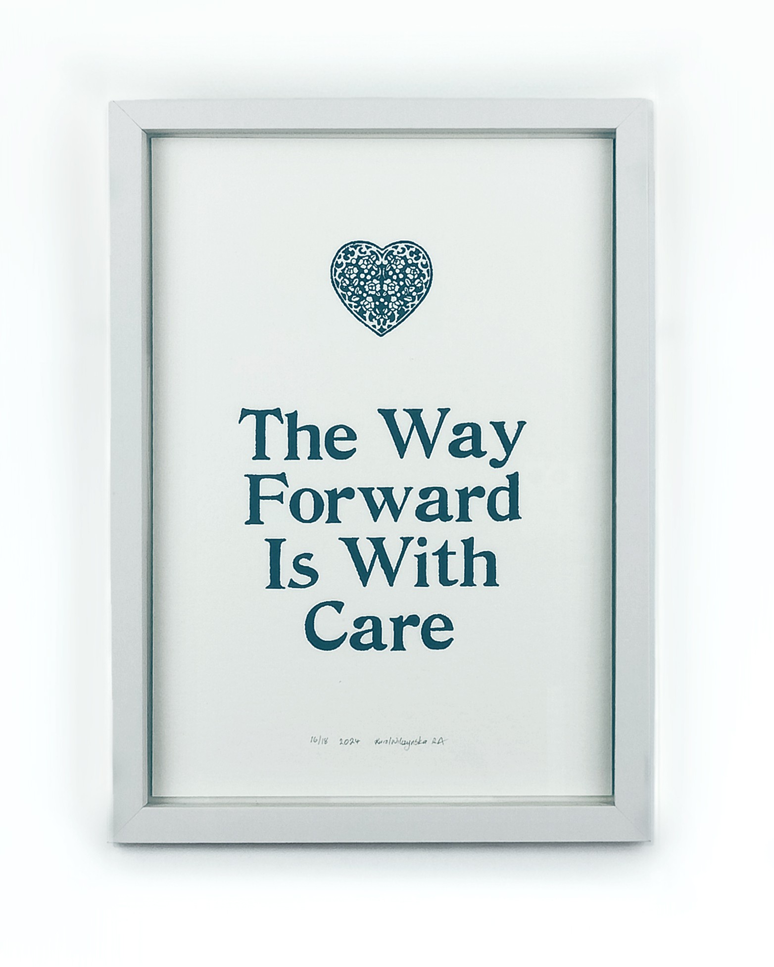 Imagine this beautiful letterpress print adorning your wall, a daily reminder that care is the path to a better future. Not only is it a beautiful addition to your home, this empowering wall art serves as a reminder of the power of compassion.The elegant simplicity of the design, with its heartfelt message and intricate heart motif, creates a sense of peace and positivity in any space. Each print is meticulously crafted using traditional letterpress techniques, resulting in a unique and tactile piece of art that you can truly feel.