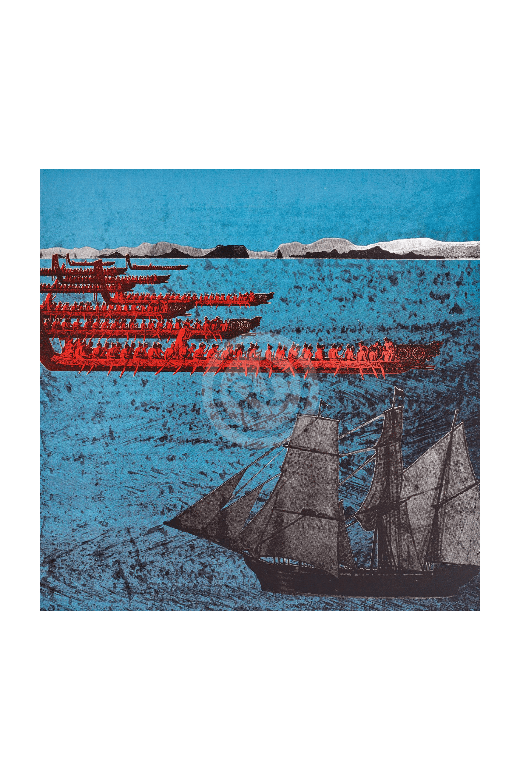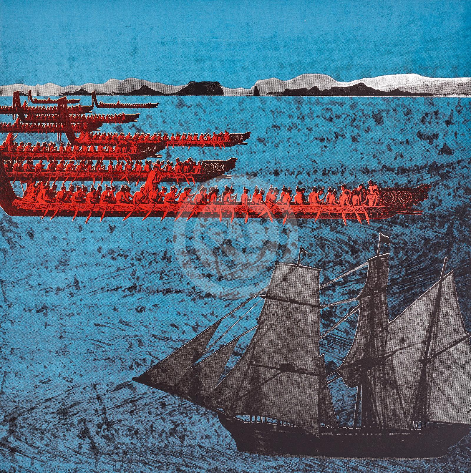 This rendering portrays the arrival of the Active and its welcome by a fleet of large waka taua. The image presents when, in the early 19th century, the head of the Church Missionary Society (based in Australia) and the governor of New South Wales (in Norfolk Island) sought to establish a link with the Arikinui of the Far North, with the aim of establishing missions in Peiwhairangi, Bay of Islands for trade and conversion to Christianity.