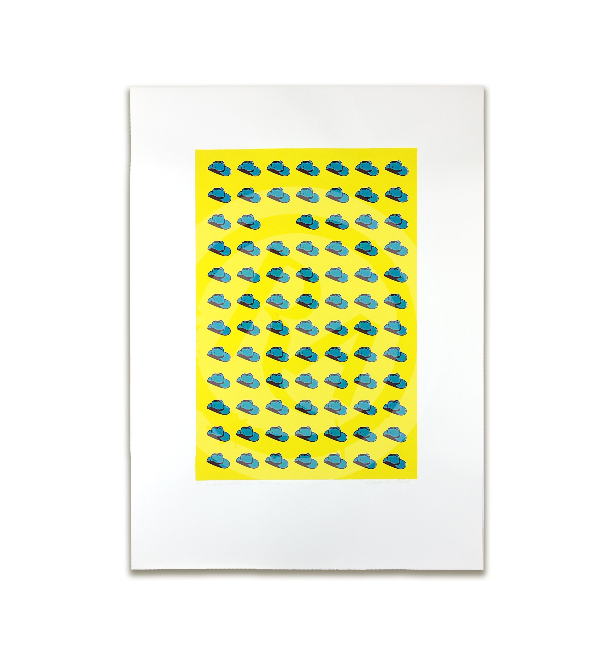 In the world of contemporary printmaking, some works speak through complexity, while others command attention through the rhythmic power of repetition. Big Country Hats falls firmly into the latter—a striking, hand-screen-printed exploration of form, colour, and the subtle tension of the missing piece.