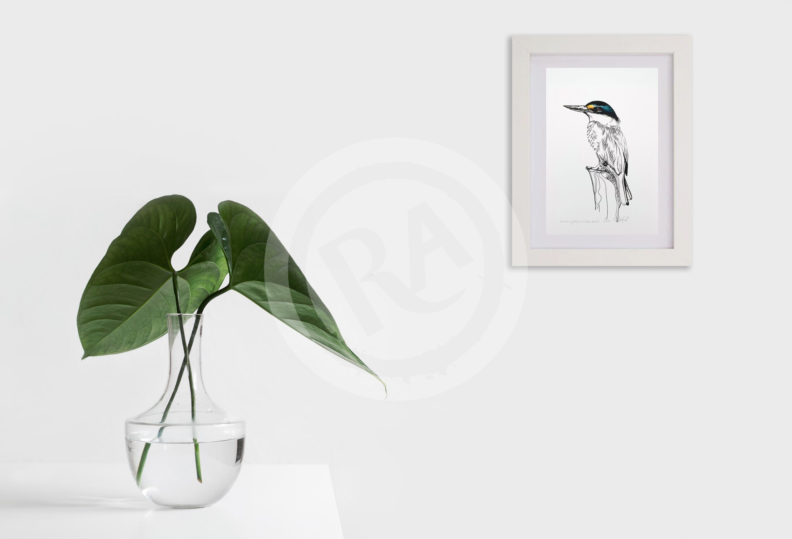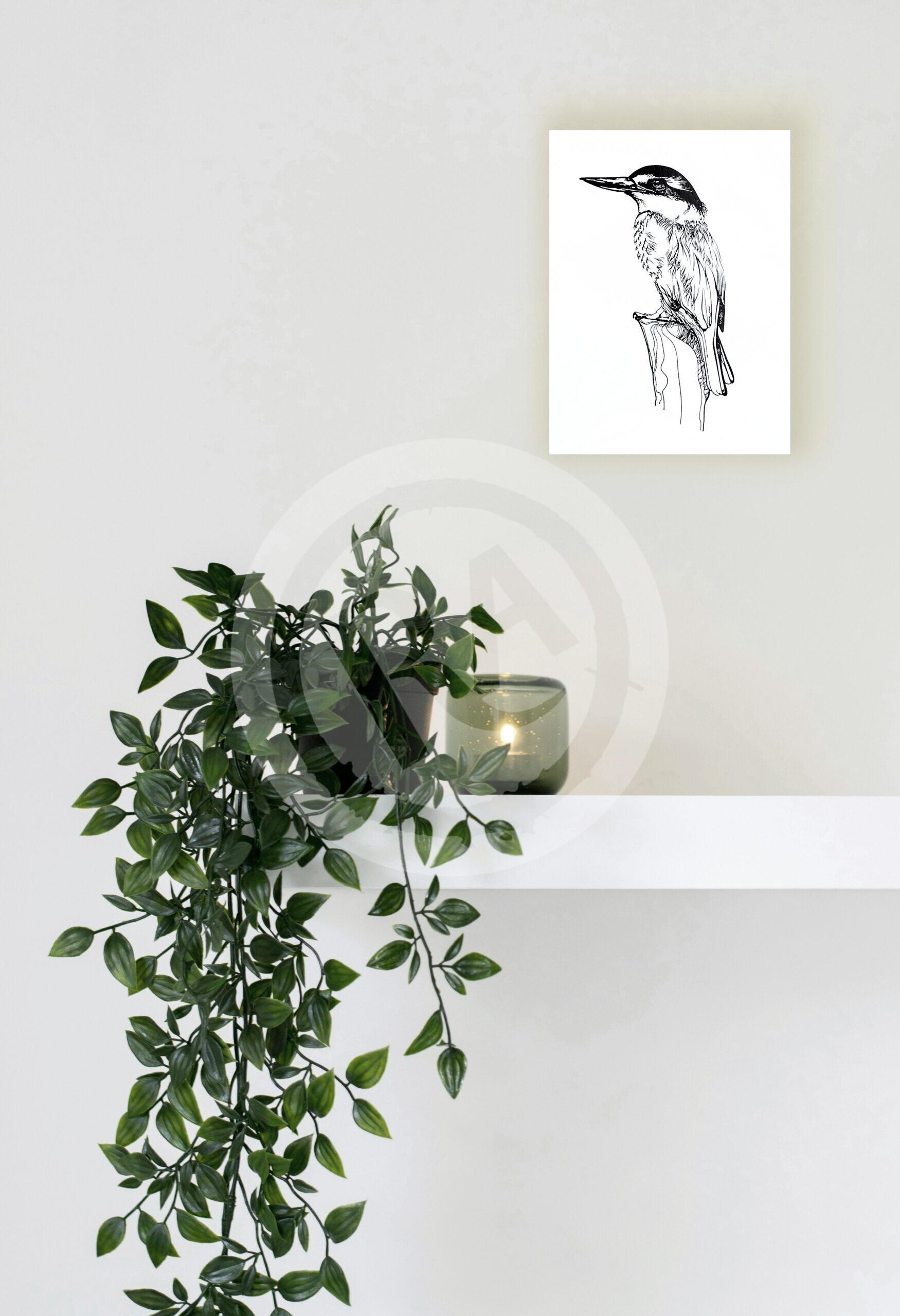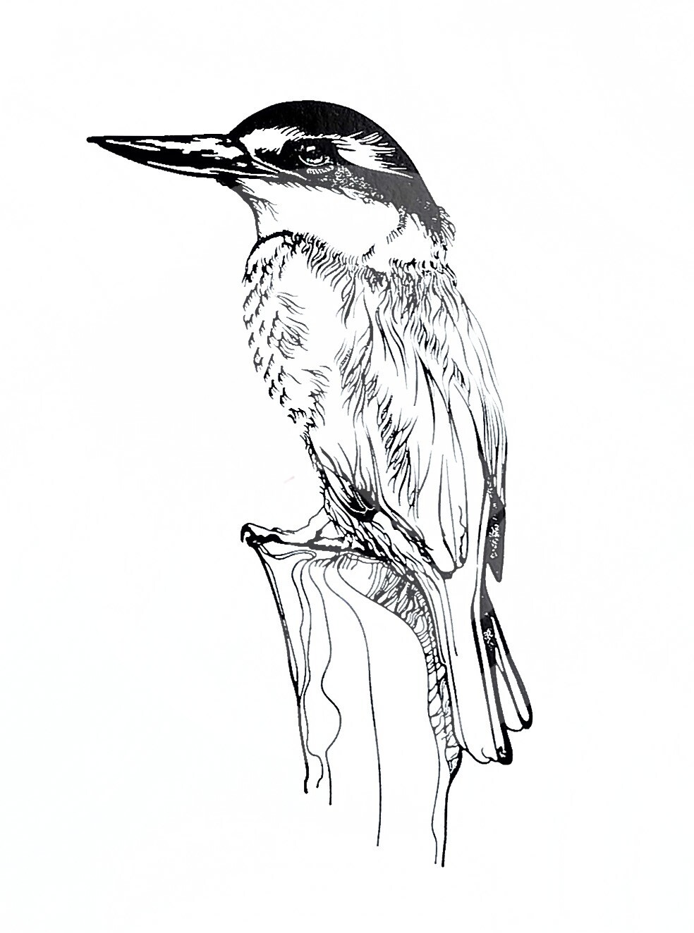 The beloved Sacred Kingfisher Kōtare! In this print, the intricate details in the artwork illustrate the delicate lines that create the texture of its feathers, the sharp curve of its powerful beak, and the curious glint in its eye. The kingfisher is perched gracefully on a branch, its body alert, almost as if it’s about to take flight in pursuit of a tasty fish.