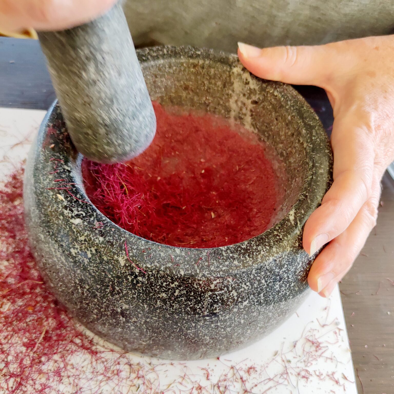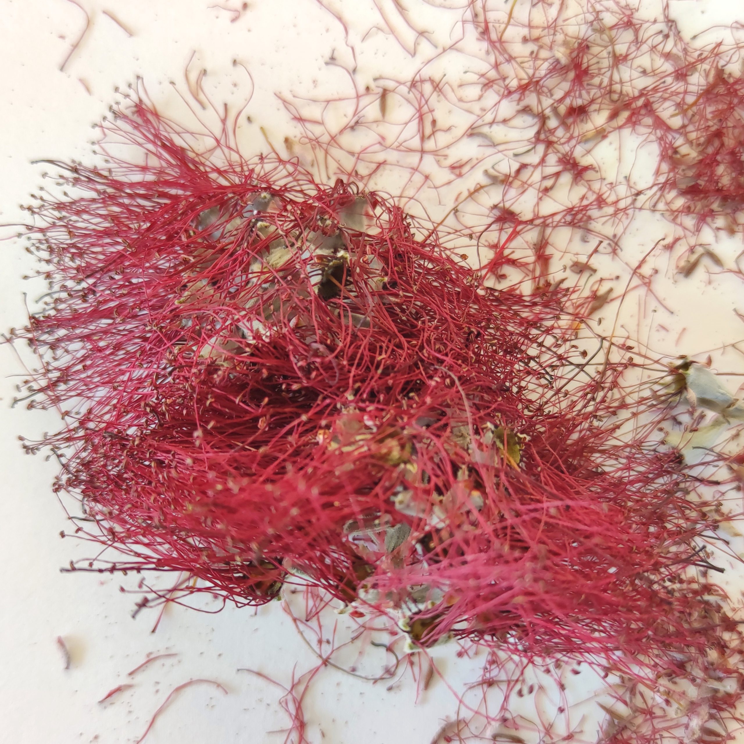 Organic phases require unique gathering processes. The six-week process for pigment manufacture from Pohutukawa stamens required first for them to be gathered direct from the tree (Figure 3a). To preserve its rich colour, the stamens were air dried (Figure 3b) before pounding in a heavy granite mortar and pestle (Figure 3c), then ground further with a fine spice grinder. Heating the phase and mixing in carriers of distilled water, isopropyl alcohol, and refined Linseed oil provided different colour densities (Figure 3d). The Pohutukawa stamens changed colour when dried, from intense red to a muted or sober neutral colour. The lighter shade of pink required more grinding and the addition of liquid Shellac as a carrier for a more opaque appearance. For both organic phases, cobalt drier was applied immediately before use. However, the volume of raw material required to produce an adequate pigment base for ink was too great for this study.