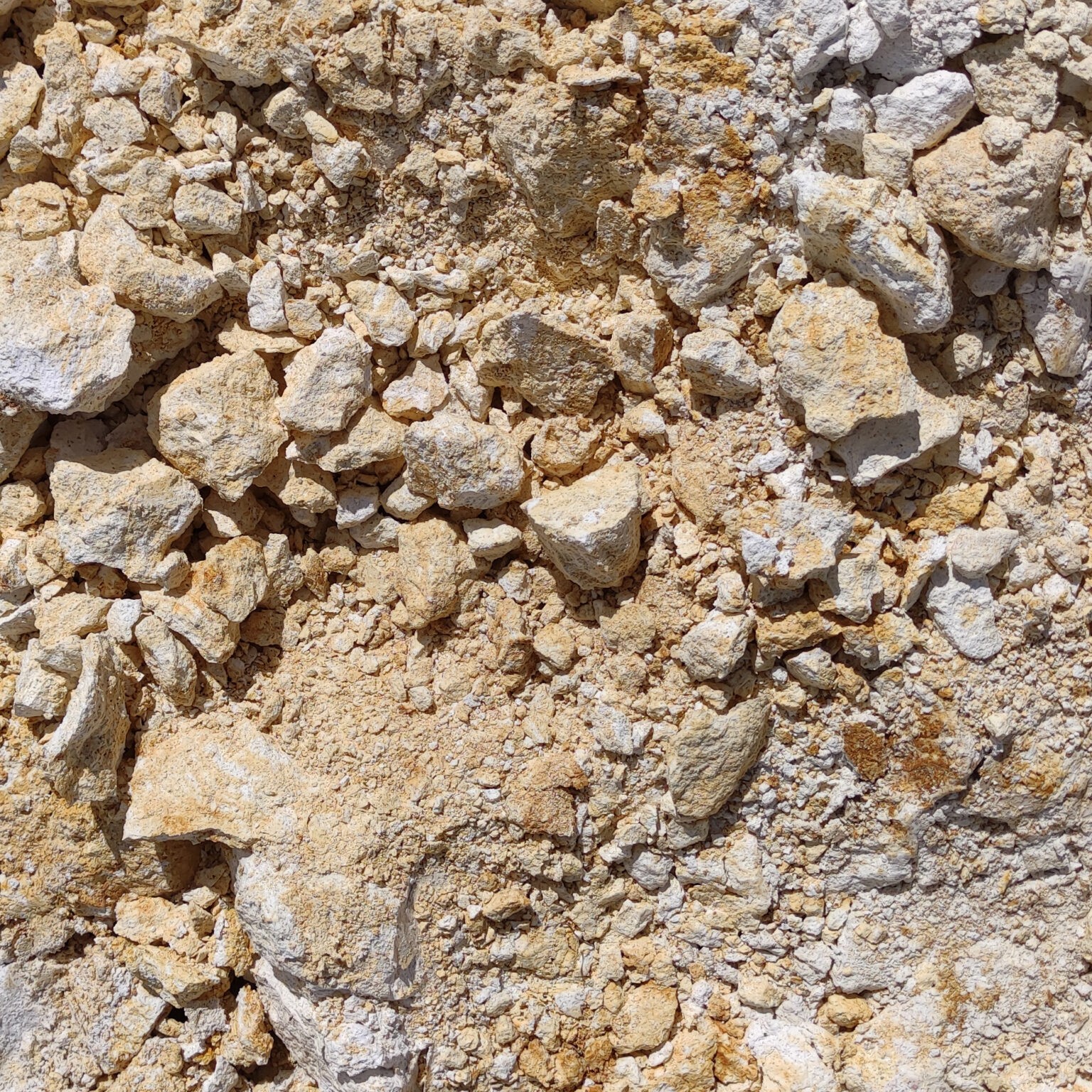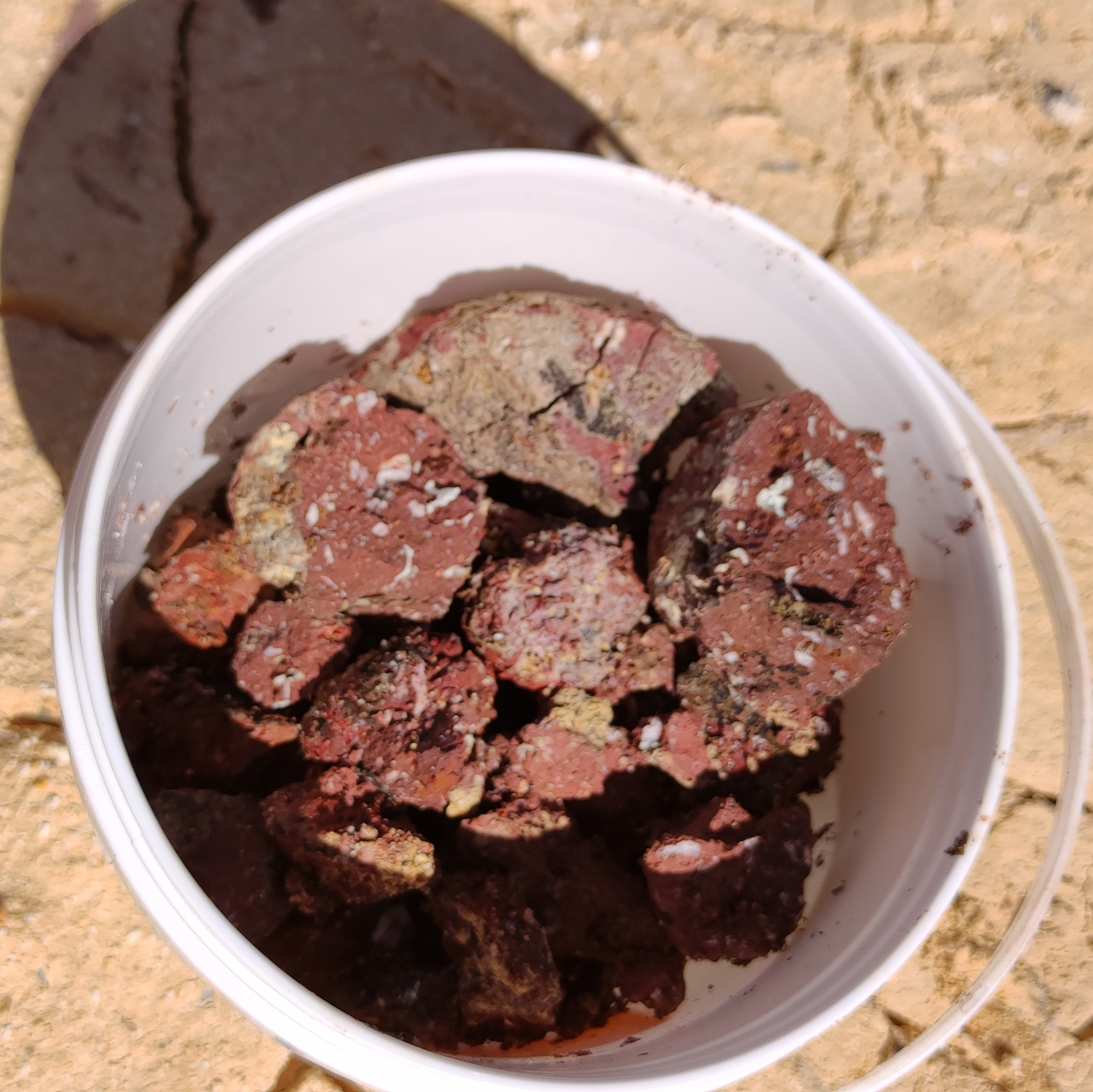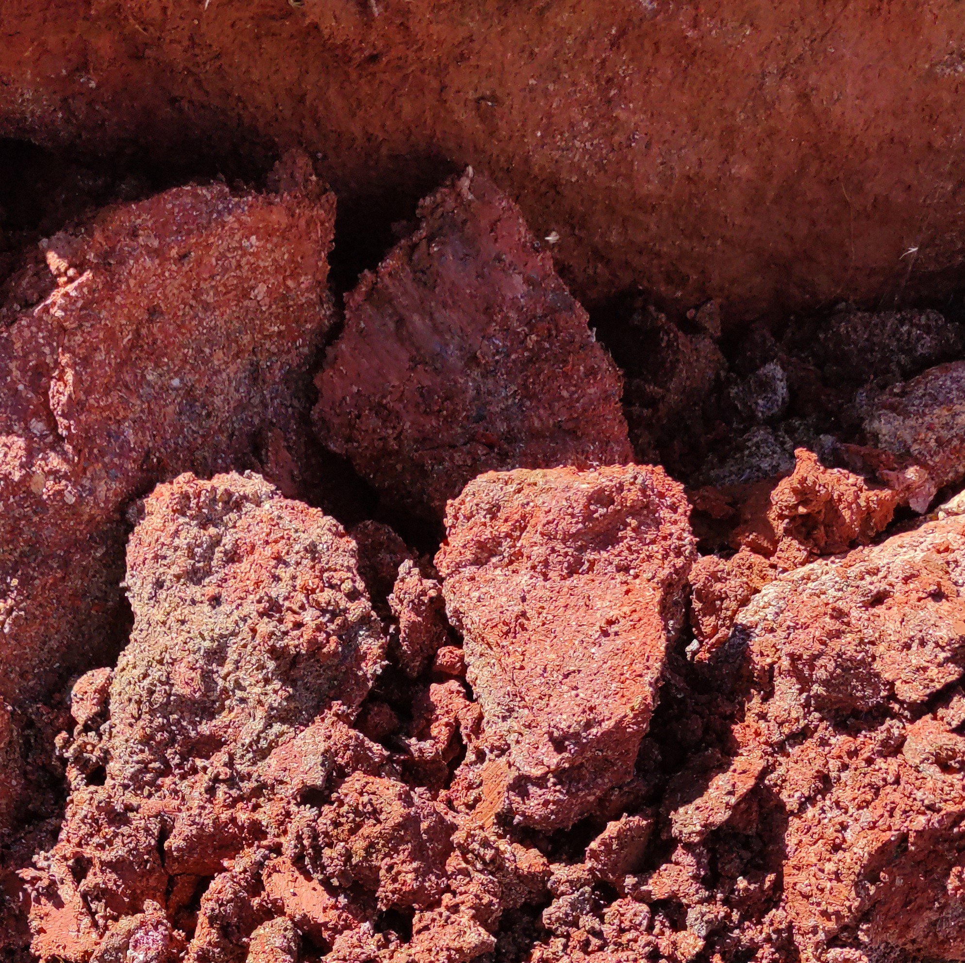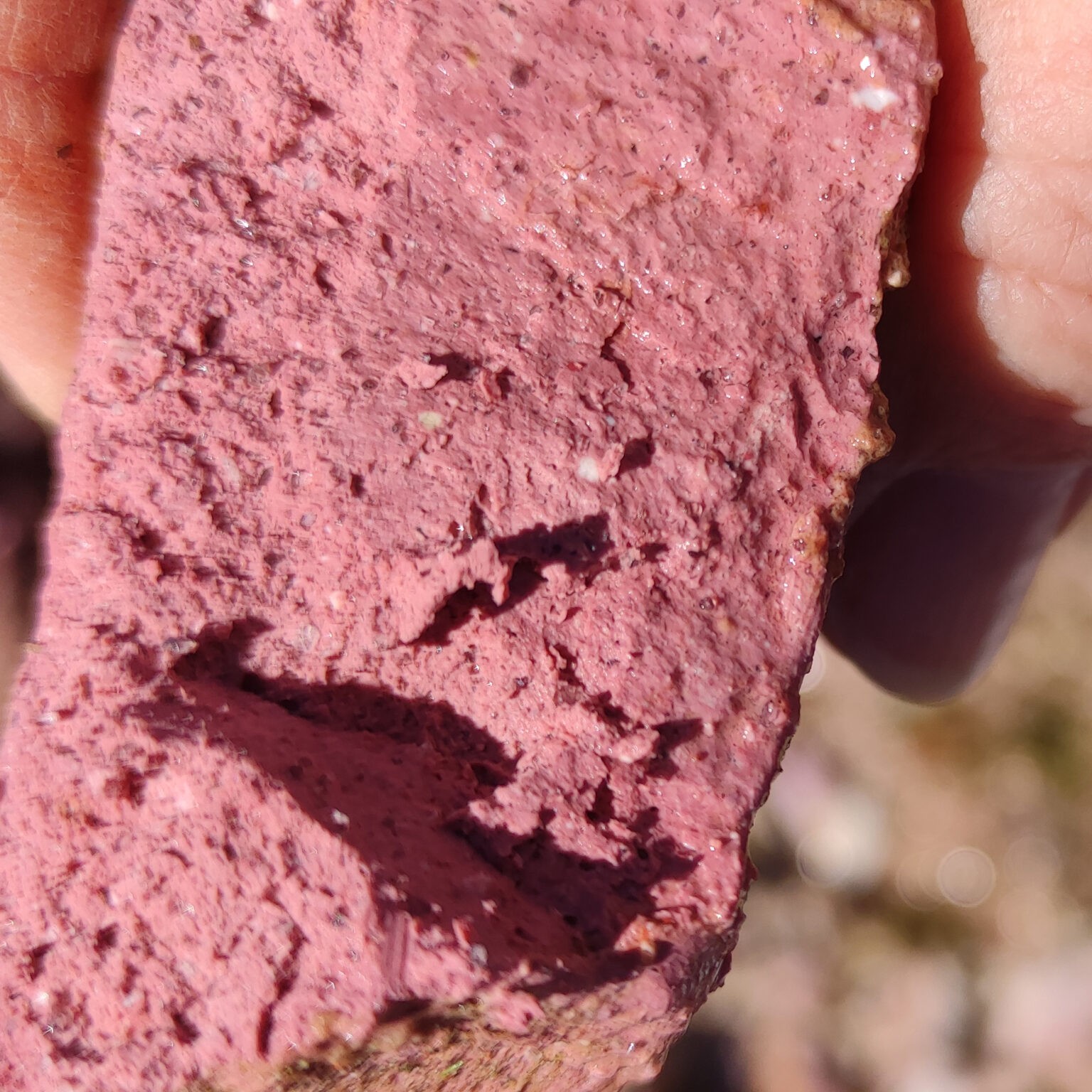 To obtain consistency in pigment, the inorganic phases are manually sifted and sorted by colour. The clay is then broken down by physically breaking into particles. For the small samples, this is achieved with a mortar and pestle and forceful heavy weight application. However, the ideal outcome is to achieve consistency of colour which requires a larger volume of ink. For this, the broken up clays are mixed with a dispersant of sodium hexameta phosphate, Calgon, as a 10% solution and added at a rate of 15ml/kg. The solution separates the clay particles and allows heavy particles to settle out. The clay solution is then is mixed with a liquid polymer flocculant, Crystalfloc, at a rate of no more than 1ml/1l. The reaction causes the solution to dewater, that is for the clay particles to clump together and to drop to the bottom of the container. The liquid is decanted off and the clay dried thoroughly. When dried, the clay is ground until it achieves a particle size of around 1.5μm.