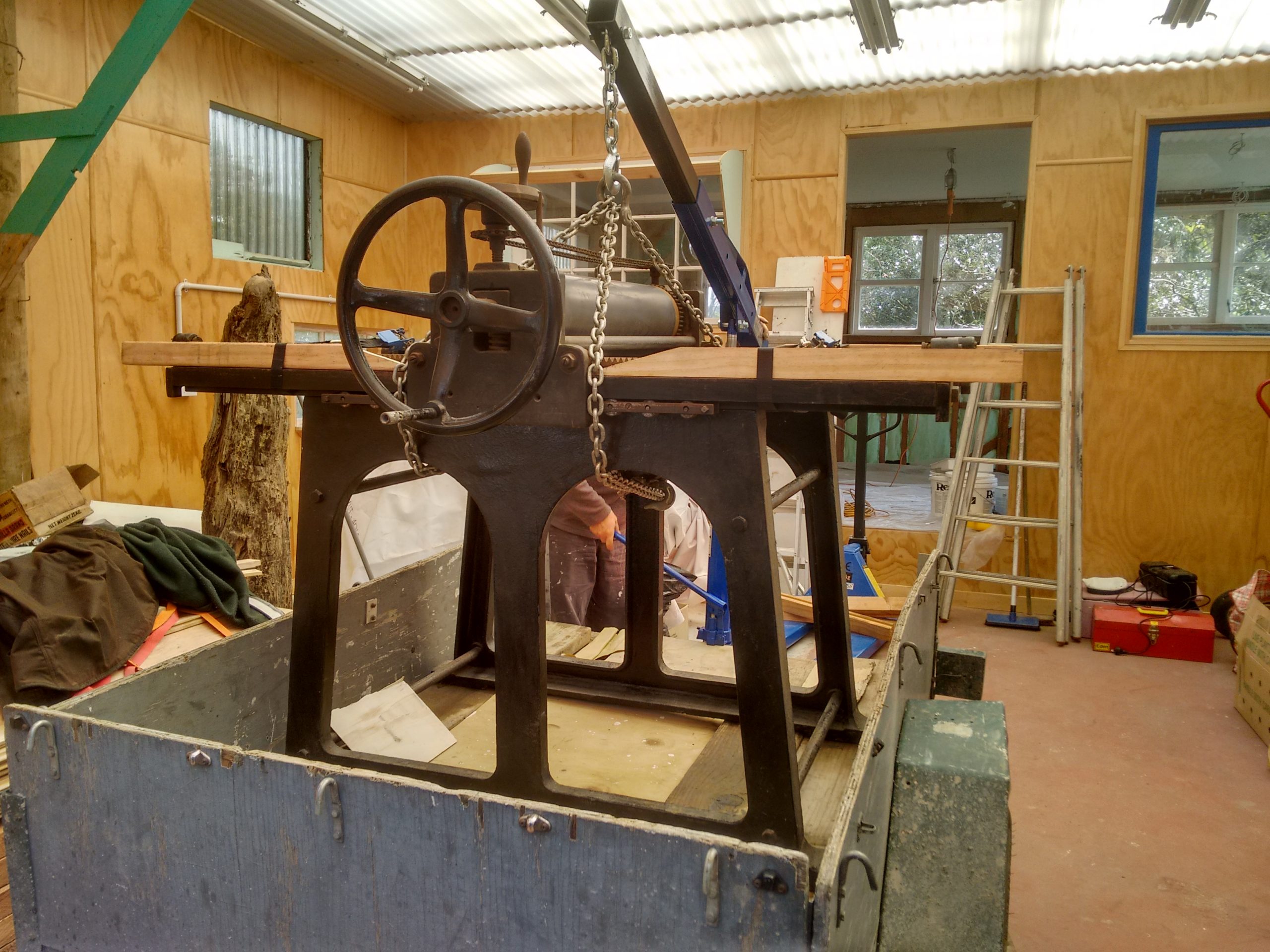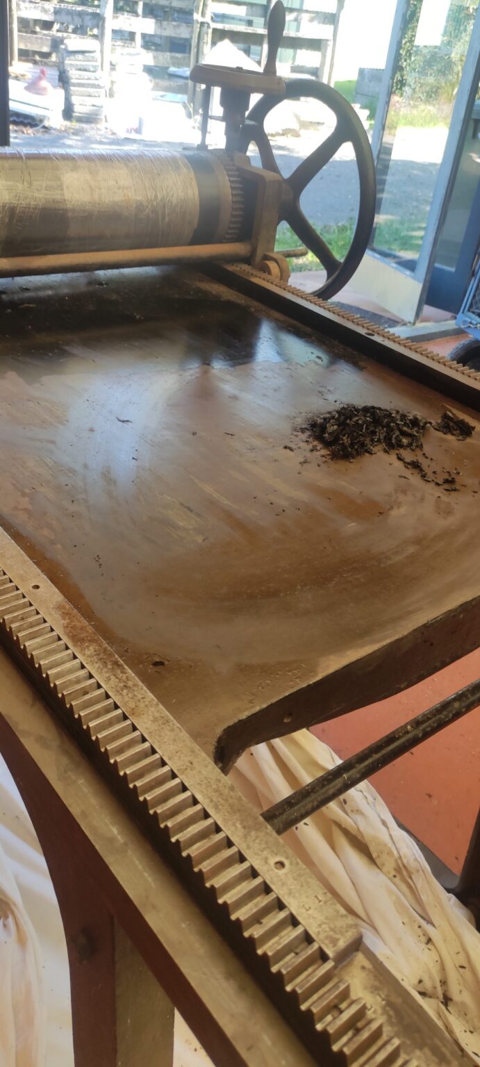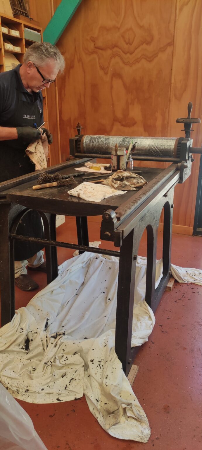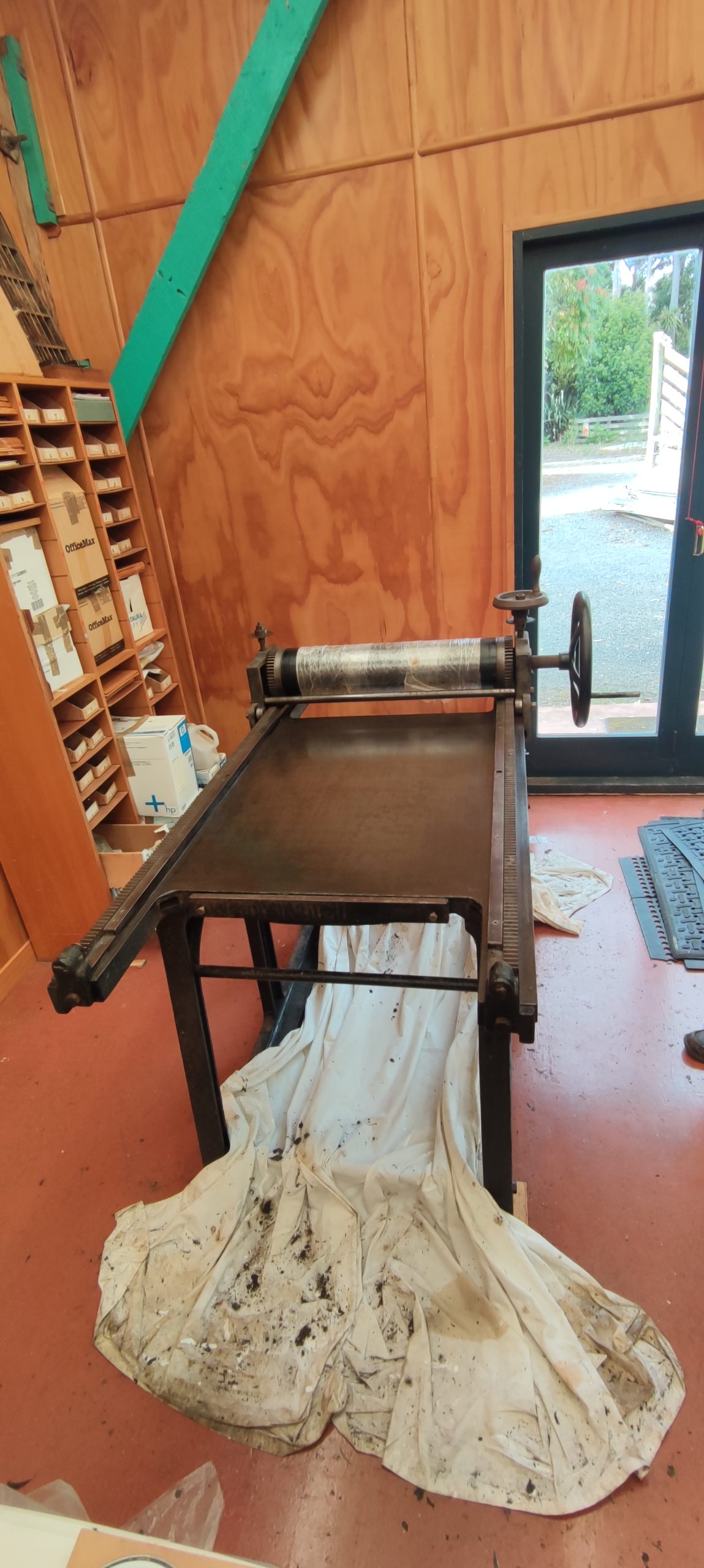 Some time ago, we were contacted about an old TH Pullan & Sons etching press that was about to be sent to scrap. It had been in use for many years at the Epsom Teacher’s College in Auckland, New Zealand but had since been moved around and left out in the elements as a piece of “visual art”. Not really knowing if we could use it, we decided to at least grab it before it was smashed up.