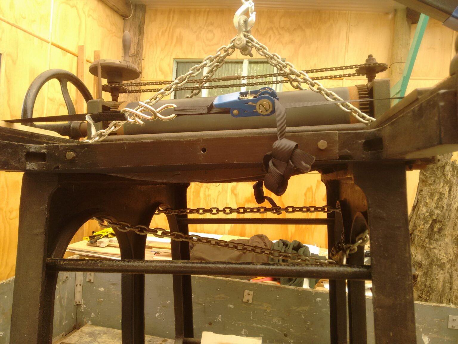 At this point we decided to not strip the whole thing down and try to do a nut and bolt restoration. Mainly because there is no manual about it, and many of the machine parts and screws appear hand made and are unique. So to take them apart may change its geometry and that may never be re-established. So instead, we have opted to pay attention to the working parts and stabilise those other parts as required. The upside is that nothing is broken or cracked.