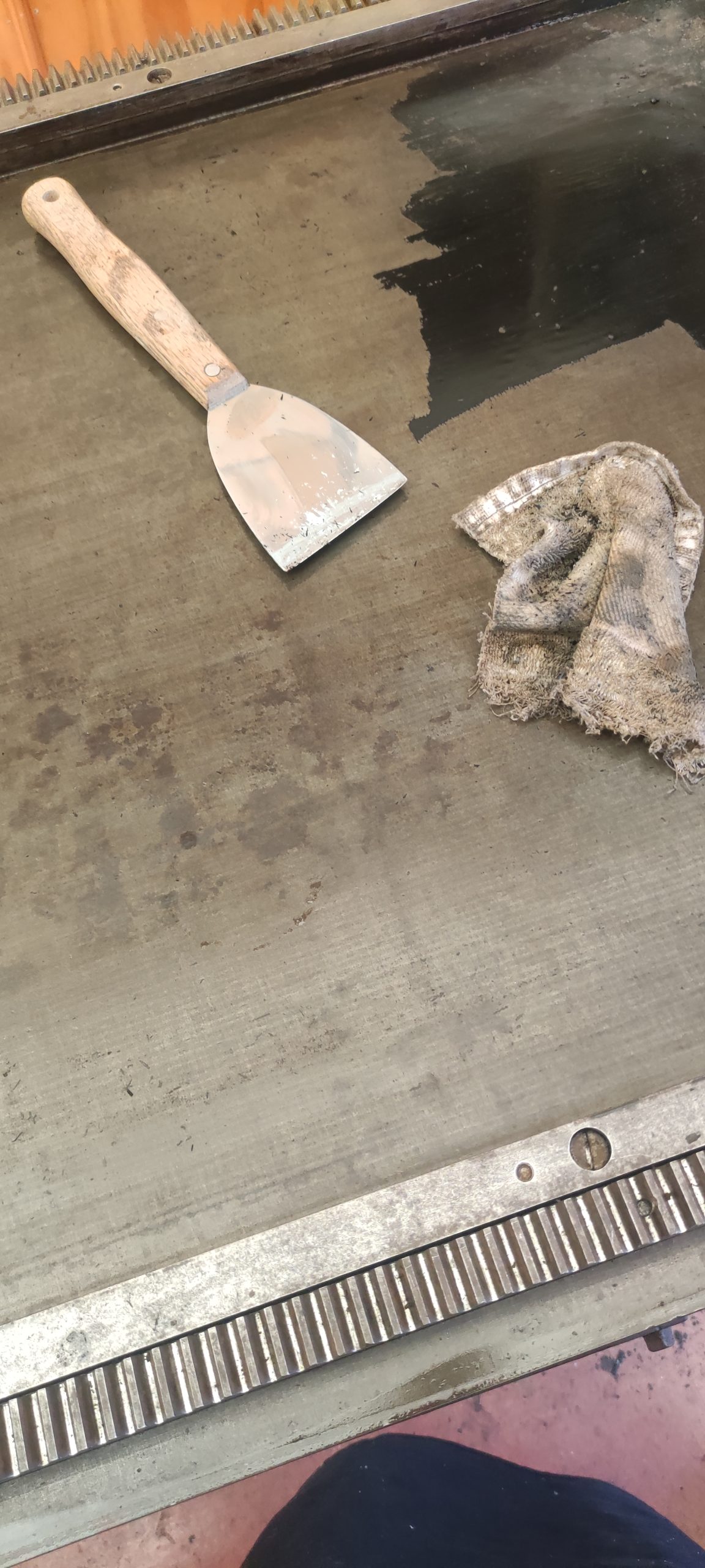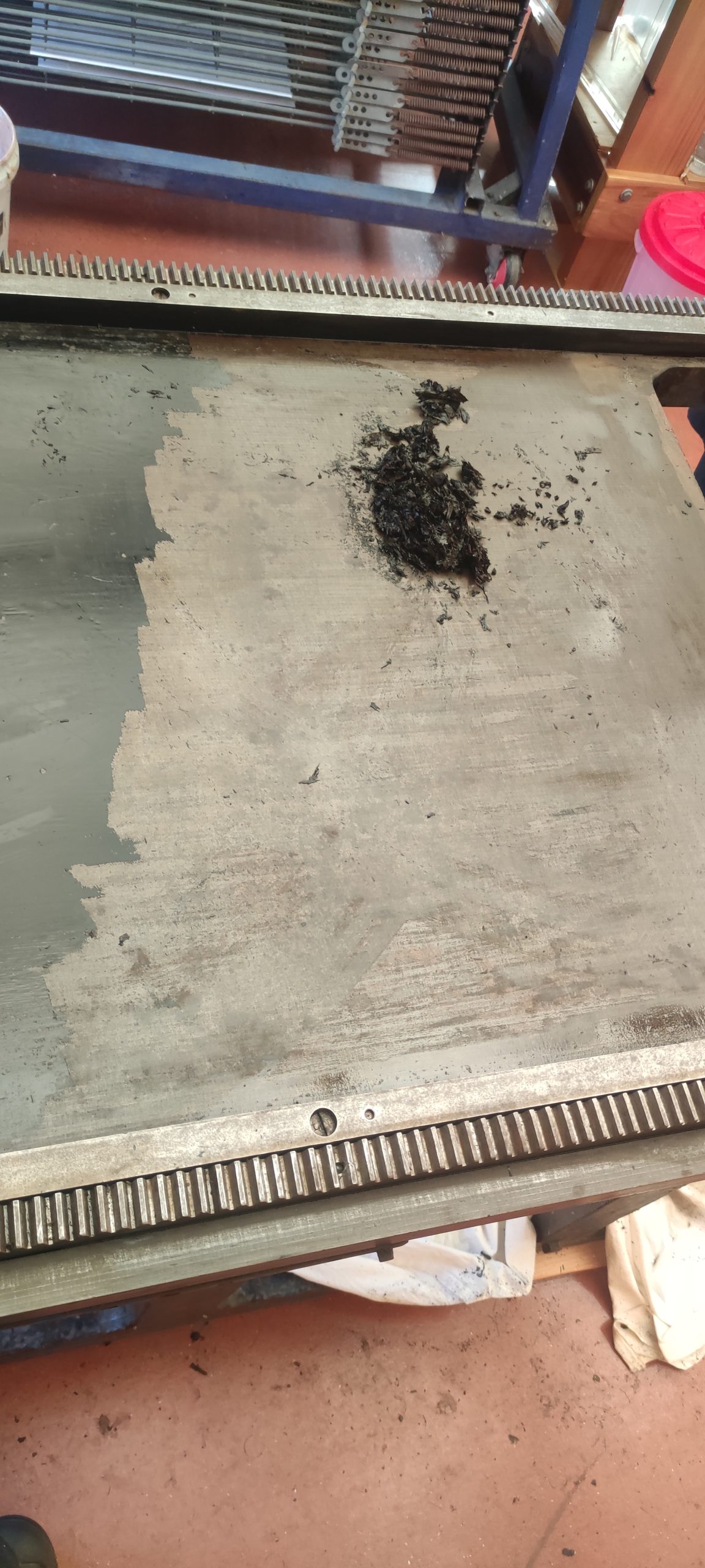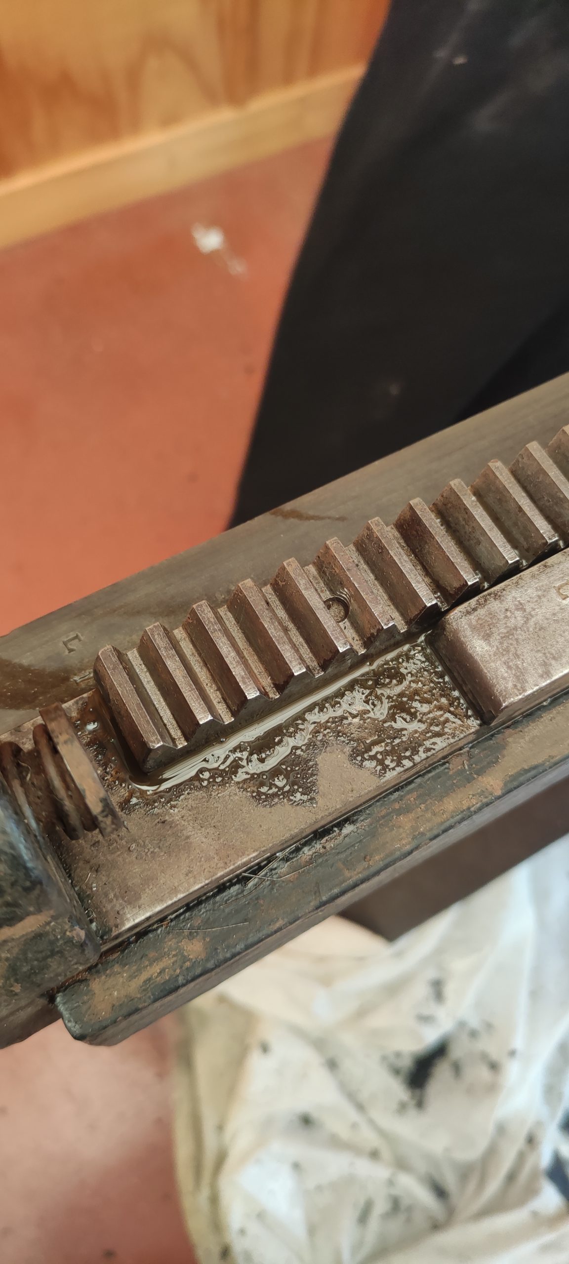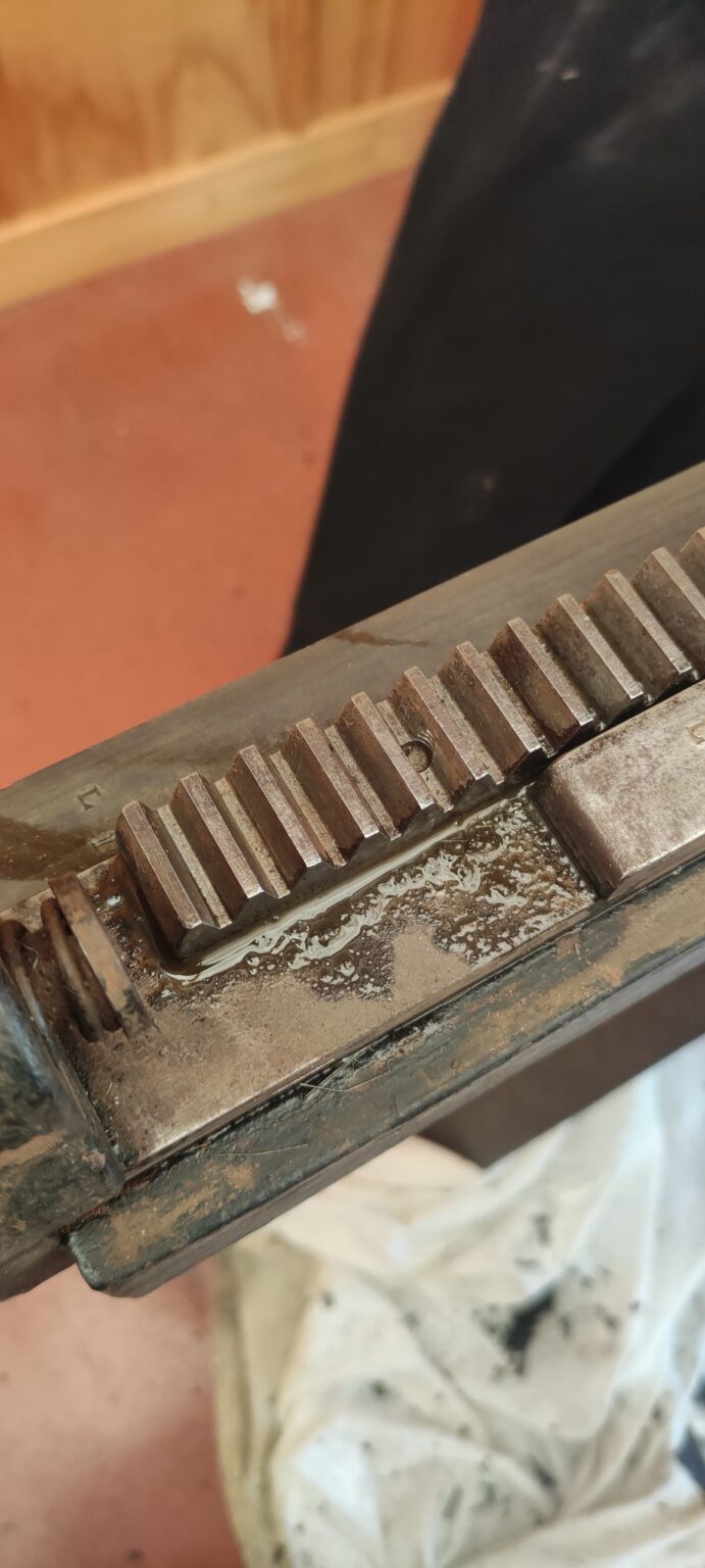 To protect all this newly exposed iron from atmospheric moisture, we have coated the exposed parts that are not normally oiled with a wax finish. This allows for a micrometer thick layer that is impervious to oils and water, and is not paint. The wax is buffed, which allows for easy movement of chases across its surface.