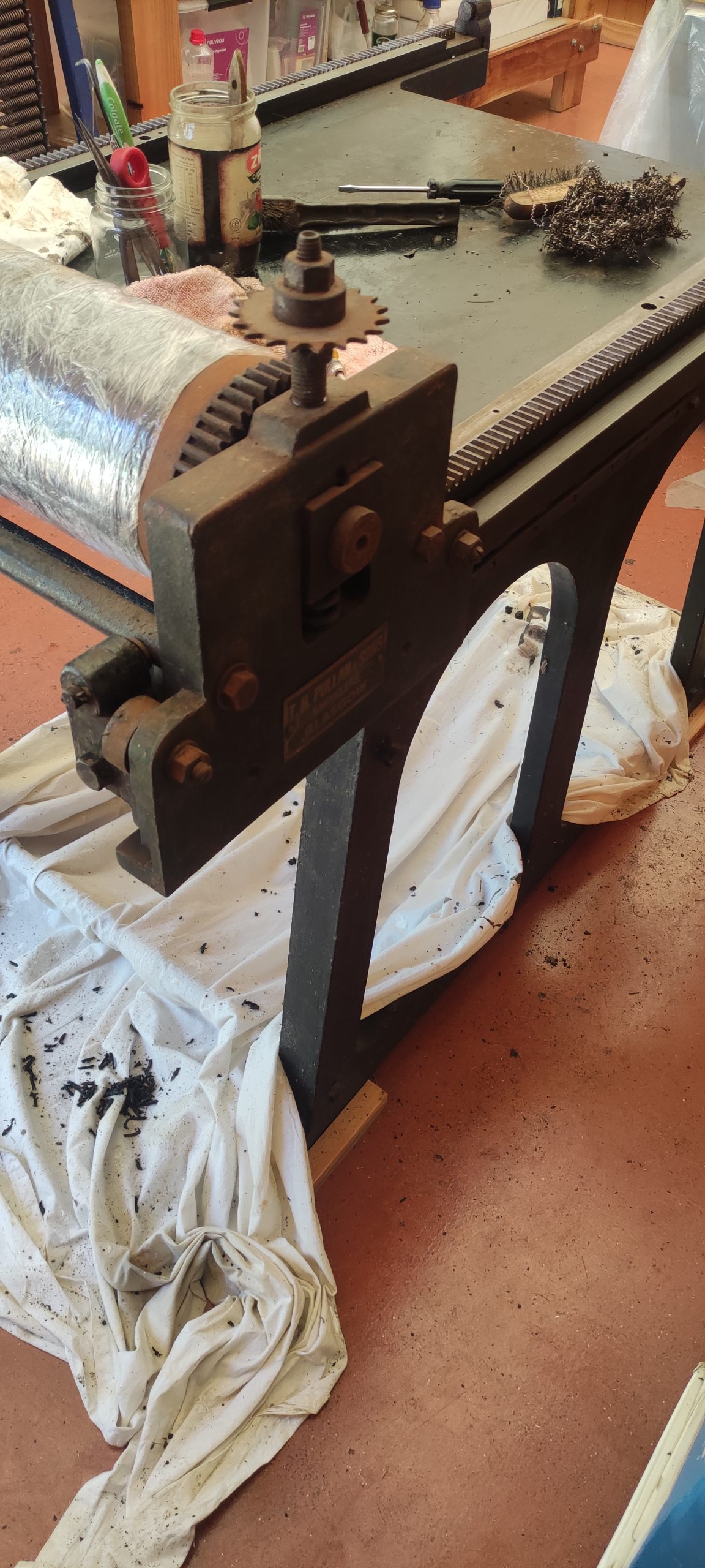Upon picking it up, the press appeared to be is fairly good condition, but it was clearly a proofing press and not a typical etching press. The makers plate only had inscribed on it T.H. Pullan & Sons, Engineers, Glasgow. There was no other information anywhere on it, and searching for its likeness returned no results. We called it the Glasgow Press for lack of anything better, and we now call it the Pullan.