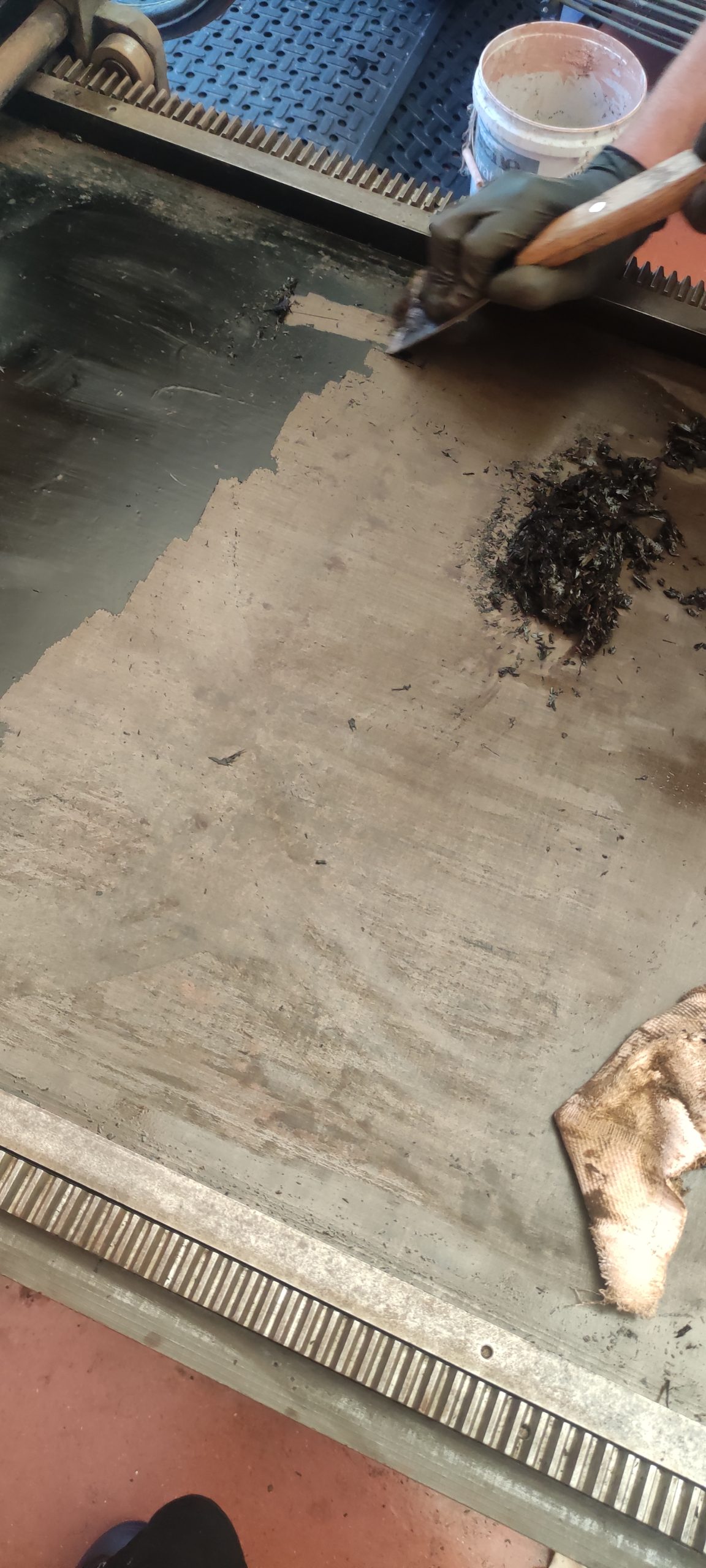Stripping off the paint was a manual process of soaking with the kero-turps mix, then gently scraping with paint scrapers and flat edged putty knives. As the layers came off, it started to become obvious that in its original state, most of this press had not been painted at all, and the quality of the iron was exceptional. A true credit to the craftsmanship of 19th century Scottish (Glaswegian) engineers. Even after over a century, the machining of the toothed tracks was perfect and the alignment almost exact (well not exact because poor use has meant that some aspects are not working well, yet). While there are some worn parts, in general the press is operational.