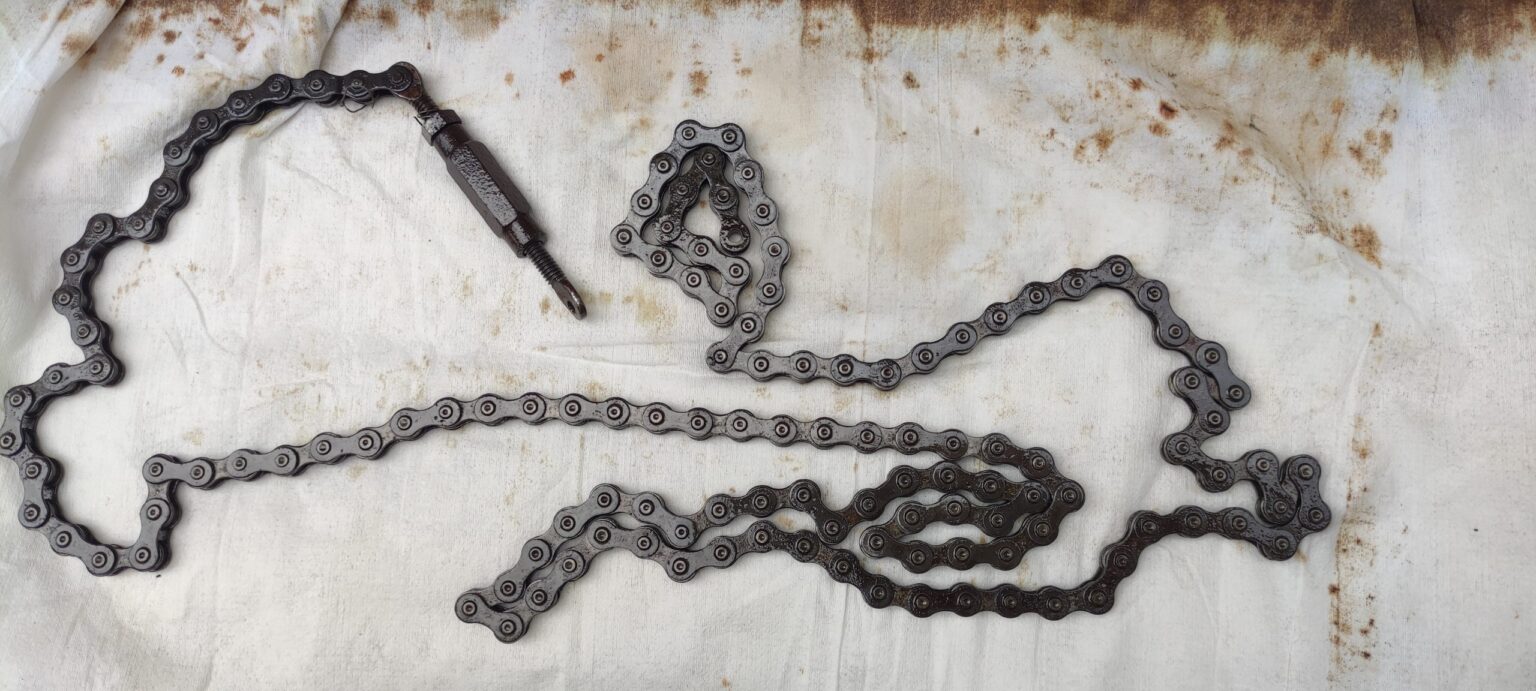 When the restoration began, we started by cleaning the muck off with a mix of kerosene and turpentine. This was to loosen and dissolve years of accumulated oils from skin cells, inks, and anything else that had accumulated. Unexpectedly, the process also started dissolving black paint! It was then that we realised that the whole thing had been liberally doused in layers of thick black acrylic enamel paint. Oh no!